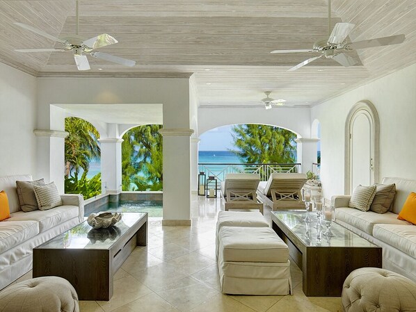 Featuring two separate sea facing terraces; the first sea facing terrace benefits from a well-sized plunge pool, two sun beds and personal stairs leading you directly to the tropical communal gardens with a freeform swimming pool and waterfall feature right onto the golden sands of Payne’s Bay Beach where exclusive sun chairs, umbrellas and beach butler service awaits. In addition, a private stairway leads you to the tropical communal gardens where you’ll find a freeform swimming pool and waterfall. From here you can access the white sands of Paynes Bay Beach for more private lounging options.