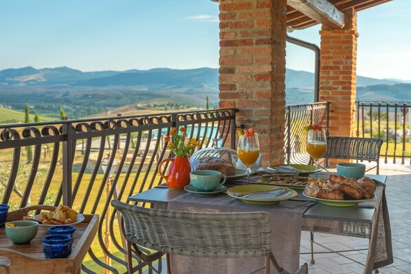 Zweiter Stock: Große Suite mit Doppelbett, Whirlpool, Badezimmer mit Dusche und Zugang zu einer Panoramaterrasse.