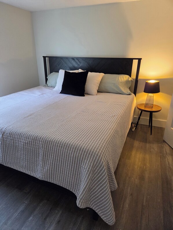 Enter from the porch into the spacious kitchen with electric stove, refrigerator and dishwasher. Dining room table is great for dinner and playing games or relax on the sofa and stream a movie with the Roku. The cottage is currently setup for 4 with 2 bedrooms each with king size beds. One full bathroom and one half bathroom in the laundry.