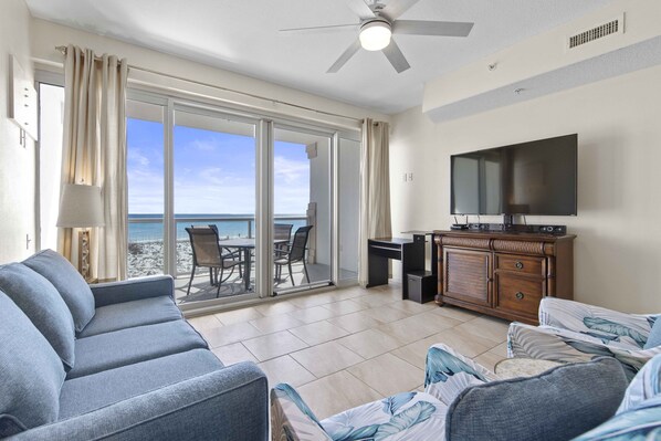 Beautiful 1 Bedroom, 1 Bath condo directly overlooking the Gulf of Mexico. Relax on your balcony as you take in a dazzling Pensacola Beach Sunrise over the Gulf of Mexico. In your comfortable private retreat, you'll find the aesthetic touches and thoughtful amenities that make your stay a constant pleasure for you, your family and friends. This uniquely decorated residence has a gourmet kitchen, washer and dryer,  dining room, spa-inspired bathrooms, spacious bedroom and large balcony. Each unit has a large living and dining room, kitchen with breakfast bar, a primary suite, and guest beds.