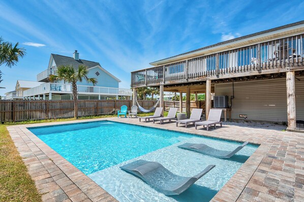 Welcome to Sun and Sand Retreat in Pensacola Beach. This three-bedroom and two-bathroom house is a short drive to the lively area of Pensacola Beach with plenty of shopping, restaurants, and beach activities. The home accommodates up to nine guests and has a one-of-a-kind private pool with heating capabilities for an additional fee of $100 per day and built-in loungers. Sleeping arrangements include a king master suite with a private bath, a guest bedroom with a queen bed, a second guest bedroom with a full-over-twin bunk bed, and a living room sleeper sofa. Enjoy a propane grill on a large deck, a great hangout area under the house in the garage, a washer and dryer, and smart TVs throughout the house. Take a short drive to one of the nearby beach access points or the Pensacola Beach Boardwalk. Book your trip to Sun and Sand Retreat!