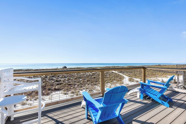 Die Hauptetage ist ein offenes Wohnkonzept mit Blick auf den Golf von jedem Punkt. Mit bequemen Sitzgelegenheiten für TV oder Golfblick, einem Essbereich für 6 Personen und einer gut ausgestatteten Küche zum Knabbern oder Zubereiten von Mahlzeiten ist dies ein großartiger Treffpunkt für Ihre Gruppe. Das riesige Golf-Vorderdeck liegt direkt vor der Tür und lädt zum Essen, Grillen, Faulenzen oder Sonnenbaden ein. Auf dieser Etage befindet sich auch ein großes Schlafzimmer mit 2 Queensize-Betten und einem Vollbad.