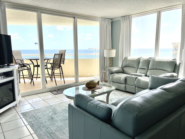 Newly remodeled retreat with magnificent double window views! New luxurious furniture with fireplace and leather electric reclining sofa. A new Italian leather sleeper sofa is so comfy. New dining and bedroom furniture ready for our guests. Stunning panoramic sunset views! Guests love the option of an indoor heated pool and outdoor pool and hot tub overlooking the ocean.