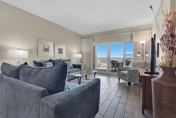 Sandy Key ist der perfekte Ort, um Jahr für Jahr Spaß mit der Familie zu haben. Diese beliebte Einheit mit 2 Schlafzimmern und 2 Bädern bietet den Luxus eines uneingeschränkten Blick auf den Golf sowie sofortigen Zugang zu allen Annehmlichkeiten. Die Master-Suite verfügt über ein Kingsize-Bett, eine Dusch- / Badewannen-Kombination im angrenzenden Badezimmer, einen herrlichen Blick auf den Golf von Mexiko und eine Glasschiebetür zum Innenhof mit Blick auf den Strand. Das Gästezimmer verfügt über 2 große Betten, die sich gut für zusätzliche Paare oder Kinder in Ihrer Gruppe eignen. Die voll ausgestattete Küche ist der perfekte Ort für den Küchenchef der Familie, um eine wundervolle Mahlzeit mit Meeresfrüchten zuzubereiten. Sechs Personen können bequem am Esstisch sitzen, drei weitere an der Frühstücksbar. Neben einem spektakulären Blick auf den Golf von Mexiko und dem einfachen Zugang zur privaten Terrasse bietet das Wohnzimmer komfortable Sofas, einen großen Flachbildfernseher und einen DVD-Player. Dieses Gerät ist perfekt für diejenigen, die den Komfort des Strandes und des Pools direkt vor ihrer Tür wünschen. Alle Einheiten verfügen über Kabel, WIFI und Waschmaschine und Trockner in voller Größe. Das Anwesen bietet einen 800 Fuß langen Privatstrand, 2 Pools, einen Whirlpool, einen großen Tennisplatz, ein Fitnesscenter, Grill- und Picknickplätze sowie einen privaten Parkplatz in der Wohnanlage. Rauchen und Haustiere sind nicht gestattet.