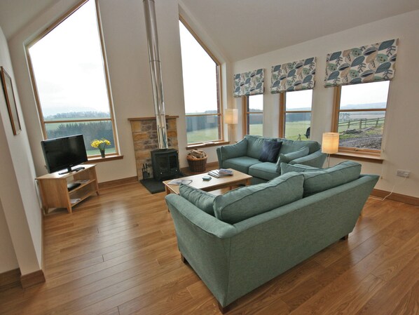 Shower Room: Shower, Toilet. Electric central heating, electricity, bed linen, towels and Wi-Fi included. Initial logs for wood burner provided. Travel cot and fireguard available on request. Use of owner’s freezer.. Use of shared garden area with garden furniture. Storage space available for outdoor equipment on request. Private parking for 2 cars.. Cart Shed is a newly renovated semi detached cottage enjoying breathtaking, uninterrupted views over open countryside toward the Lomond Hills. The  interior of this wonderful property has been tastefully furnished and is very well appointed. The lounge has two marvellous large windows affording guests no other option than to sit back and enjoy the panorama. A lovely, cosy wood burning stove completes the tranquil ambience. The compact kitchen is well equipped with the benefit of a stunning view to boot! The double bedroom has a fantastic arched window, which was originally the opening of the doors into the cart shed. The cottage is part of a courtyard, one of three beautifully converted traditional stone built properties situated on a working farm at West Newton of Balcanquhal, only 2 miles from the pretty, rural village of Glenfarg where amenities include a shop, play park and tennis courts.