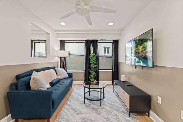 Bright and open, the living room features stylish seating and a 55” smart TV — perfect for streaming your favorites or relaxing together.