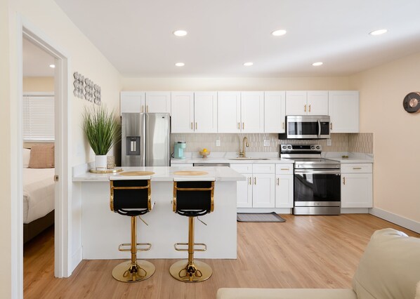 - Chef-ready casita kitchen white cabinets and breakfast bar seating for two