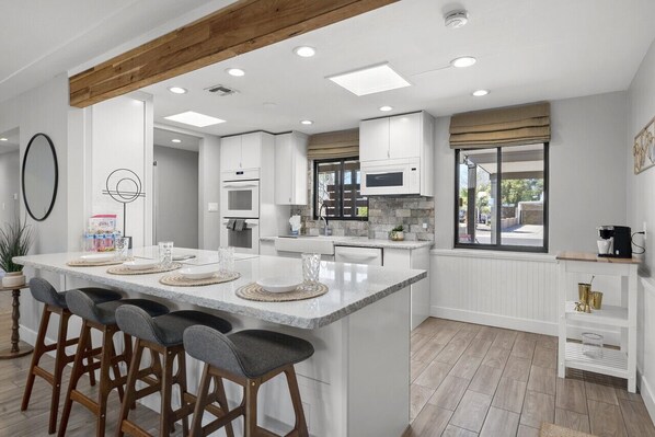 As you enter through our front door, the kitchen will be directly to the left and the bedrooms will be down the hallway to the right. As you make your way to the back of the house, there are two seating areas to enjoy your favorite show and movies on Hulu Live TV.