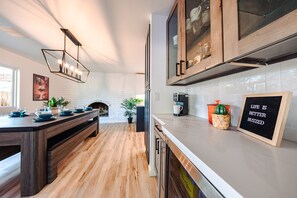 Dry bar with wine fridge, coffee bar, stocked with all your essential cups & shot glasses.
