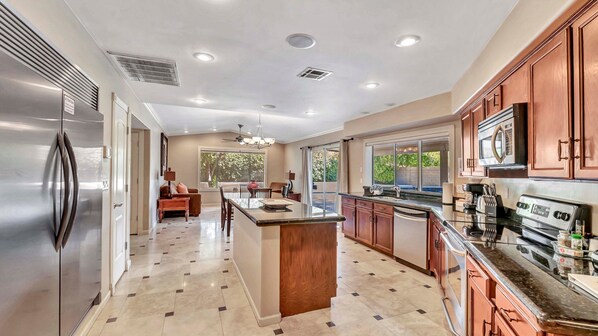 You know what they say: Location! Location! Location! This is the very best location in all of Scottsdale. Centrally located on a quite cul-de-sac super close to the Kierland outdoor shopping mall, this beautiful home is fully equipped and set up for you to enjoy. The home has an "L" shaped split floor plan which wraps around the outdoor pool area with an open, modern kitchen and main living area situated between the the bedrooms on each side of the home. The neighbors are all super friendly ensuring that your stay will be highly relaxing and pleasurable. You will enjoy absolute privacy and feel right at home the moment you walk through the door. The backyard is lush and super private. The swimming pool is huge and has a very large shallow area ideal for water sports, as well as a large are of deeper water for the super swimmers in your group.