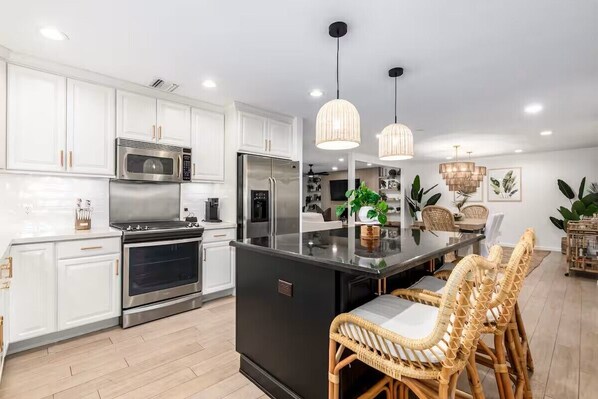 Please note that there are two extra indoor dining chairs that are not pictured! There is dining space for 8 at the indoor dining table, with seating for three more at the kitchen island for indoor dining. There is space for 8 at the exterior dining table, with space for 4 more at the exterior cocktail table attached to the built-in grill!