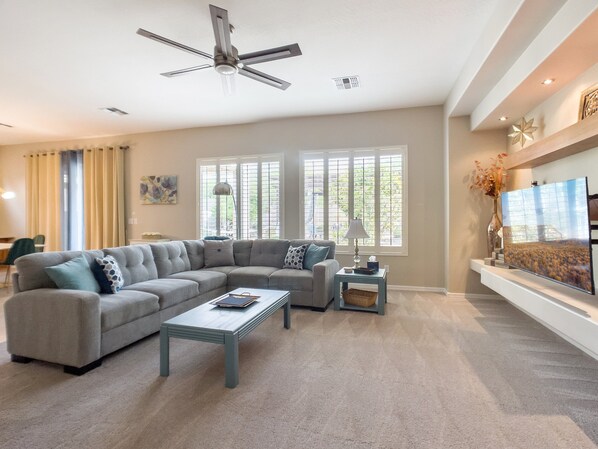 This pristine three-bedroom, two-bathroom home offers all the amenities for a perfect vacation getaway or suits as a home away from home. Step into our modern home with a seamless blend of indoor and outdoor spaces. The open floor plan, high ceilings, and well-equipped kitchen create a luxurious experience. Unwind on the spacious living room couch or enjoy the private backyard with an outdoor dining area, grill, and comfy seating options. Relax in the hammock, shaded by retractable sun shades during the day and illuminated by Edison-style bulbs in the evening—a serene outdoor living space perfect for soaking in the Anthem, Arizona sunshine.