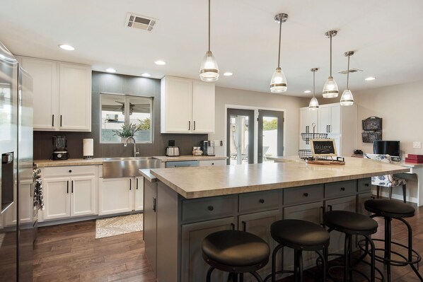 Eine Gourmetküche; Kaffee-Ecke; und 3 Schlafzimmer, darunter 1 Kingsize- und 2 Queensize-Betten mit tollen Matratzen (alle neu). Ein übergroßer Hauswirtschaftsraum mit einem Hochleistungs-Warmwasserbereiter, damit niemand ausgeht. Die extra große Waschmaschine und der Trockner für diese schnellen Ausbesserungsarbeiten sind einsatzbereit. Ihr Esstisch kann auf Platz 10 erweitert werden. Dieses Haus hat alles. Komplett möbliert, ausgestattet und bestückt. Wir bieten sogar einen beheizten Pool an (möglicherweise fällt eine zusätzliche Gebühr an). und eine Hundetür für die zugelassenen Pelztiere.