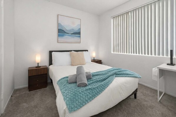 ► BEDROOM: Bed linens, extra pillows, blankets, room-darkening shades, and ample clothing storage