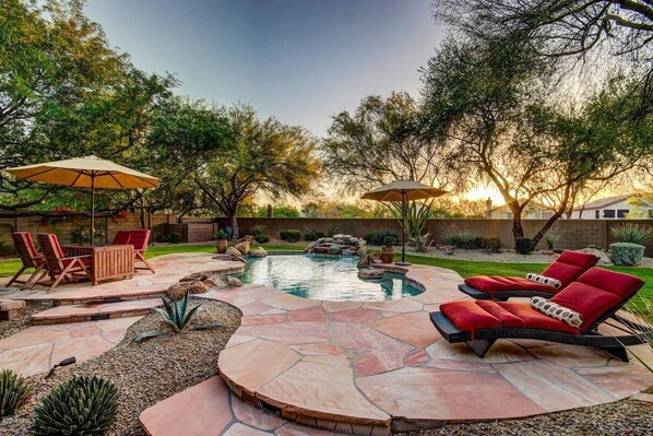 4 generations and this house was perfect. We enjoyed the waterfall pool to teach the 2 year old to swim. My son-in-law taught me how to play pool on the pool table on the social room. The little one was able to watch TV in the 3 seat lounger/couch. “Theater Room”. The 2 bedrooms on one side of the house were very large with their own bathrooms. The 2 on the other side had a shared common bathroom but that was just fine for us. 1 room had a King and the other had 2 beds. (I am not sure what size)The laundry room was nice to use. Large washer and dryer. We appreciated the high chair and pack and play for sleeping. We put it in the very very large master bath closet. We used the hot tub and loved it. We would def stay again. The neighborhood was quiet and nice. Back yard was private. The kitchen was well stocked and nice. We did cook a lot. Driving was nice because everything we wanted was easy to get to, and the traffic pace was not combat. We really enjoyed the zoo.I would rent this again and look more into snow birding in Scottsdale. We have been looking for a town. I think the comfort/quiet and serenity of this house helped give us a good vibe for the area.