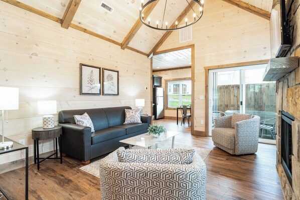 • Living Room – Queen sleeper sofa, smart TV, stone electric fireplace (seasonal)