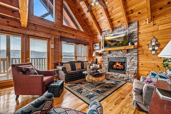 As soon as you enter this beautiful cabin, you`ll feel right at home. The living room is clean and inviting, with comfortable seating, a flat-screen TV, and large windows that showcase the breathtaking mountain views. The fully equipped kitchen has everything you need to prepare meals, including a full-sized refrigerator, stove, microwave, and dishwasher. The dining area is adjacent to the kitchen and has a large table that seats six. The cabin has two bedrooms -- 1 on each level -- both with comfortable beds and plenty of storage space. Each master bedroom has a King-sized bed. The bedroom upstairs has a connected full bathroom and also a relaxing jacuzzi tub, as well as a fireplace in the bedroom. The upstairs loft area also comes equipped with a full size pool table for hours of fun as well as additional seating and a Smart TV -- the perfect spot to binge your favorite Netflix show or the big game!