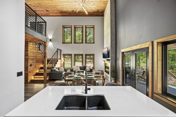 ✔ Open living area with plush seating and huge TV with sound bar and Fireplace