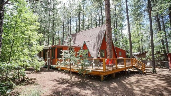 This cozy 'lodge-style,' knotty pine cabin is tucked away in the beautiful Ponderosa Pines on a large wooded private lot with a spacious wrap around deck on 3 sides of the cabin and enclosed front porch. New carpet installed, remodeled master bath, and upgraded deck in May 2016.