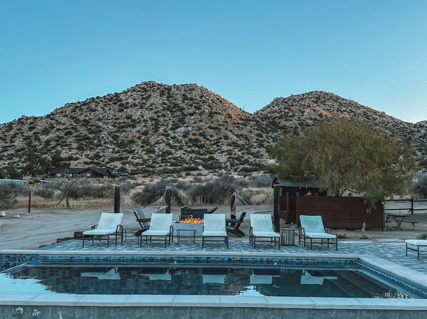 The outdoor spaces at Know Where Ranch are where the magic truly comes alive. The in-ground pool, which can be heated for an additional fee in the cooler months, invites you to float beneath the desert sun or under a canopy of stars. Surrounding the pool are lounge chairs for sunbathing, a gas firepit for storytelling, and hammocks where you can sway gently in the cool desert breeze, offering an unparalleled vantage point for stargazing. A half bathroom and two cold-water outdoor showers by the pool offer convenience and for a refreshing rinse in the hot summer days.