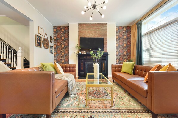 It immediately feels like home, with a comfy sofa, coffee table for drinks and snacks, and a smart TV for movie nights.