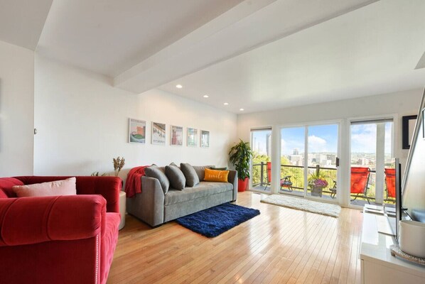 The second story includes one king bedroom with another balcony overlooking the city, a queen bedroom with a desk, and a full bathroom in between.