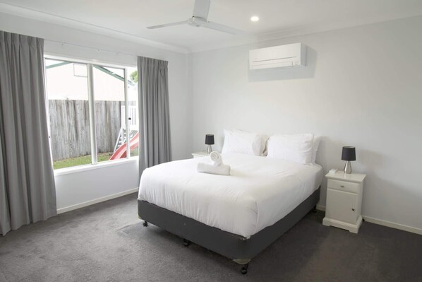 Each of the four bedrooms is thoughtfully appointed—three with queen beds and one with a single—ensuring restful sleep for all. Ceiling fans and heaters are available throughout, with air conditioning in the master bedroom and lounge.