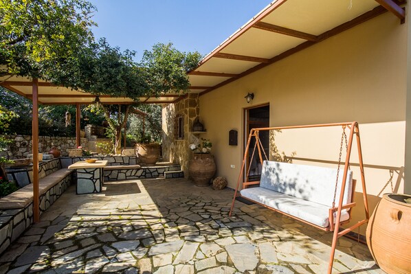 Der Außen Hof bietet verschiedene Spots zu sitzen und zu entspannen, genießen Sie Ihre Mahlzeiten und Kaffee. Es hat eine erstaunliche Garten mit Rosen und anderen Blumen, viele Bäume wie Aprikose, Pflaume, Zitrone, Granatapfel, einem privaten Olivenbaum Feld, in dem auch Platz für Sie Ihren Morgenkaffee zu sitzen und zu genießen. Wir haben auch einen großen Grill, zwei Schaukeln (eine für Erwachsene und eine für kleine Kinder). Das Haus ist von erstaunlich Olivenbaum Felder, voller Blumen und heimischen Kräutern sehr ruhig und friedlich buchstäblich umgeben.