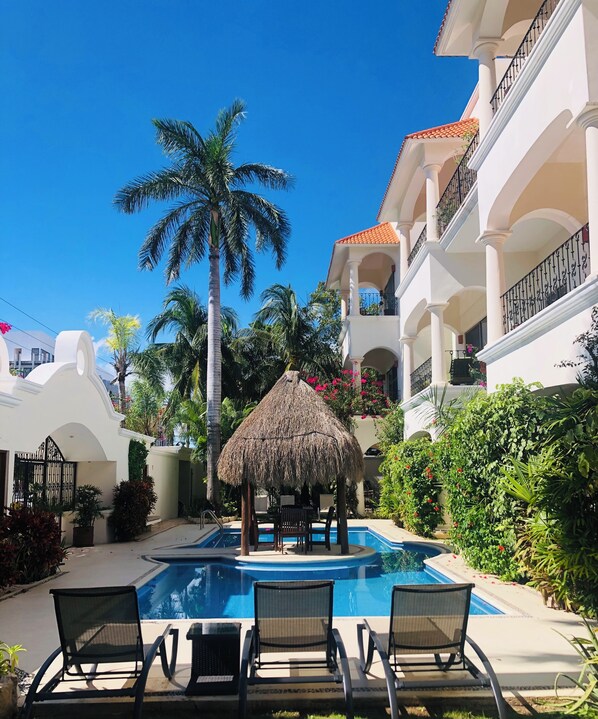 Und für die windigen Tage am Strand genießen Sie unseren schönen großen Pool mit Liegestühlen und einem schattigen Inselpalapa ... ein perfekter Ort, um sich abzukühlen, besonders mit einer Margarita in der Hand!