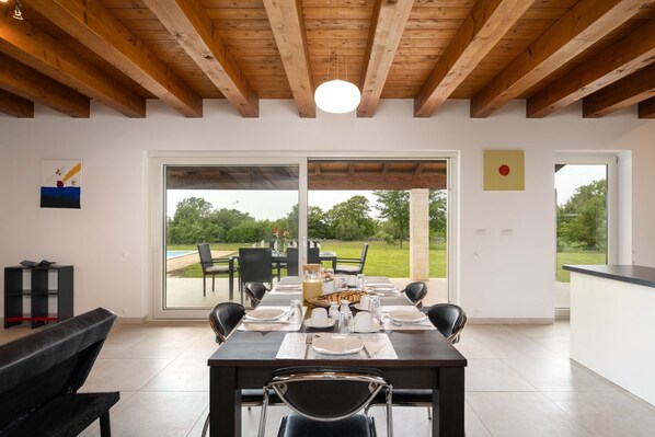 Die Villa Maslina ist eine Oase, die sich zwischen wunderschönen Olivenhainen in einer idyllischen Umgebung in der Nähe der Stadt Poreč an der Küste der Adria befindet. Diese luxuriöse Residenz bietet ein unvergessliches Urlaubserlebnis, bei dem die Verschmelzung von modernem Komfort, elegantem Design und natürlicher Schönheit in perfekter Harmonie zusammenfließt.Auf dem weitläufigen Gelände der Villa können die Gäste eine Vielzahl von Entspannungs- und Unterhaltungsmöglichkeiten genießen. Das Herzstück bildet ein wunderschöner Swimmingpool, umgeben von bequemen Liegestühlen und Sonnenschirmen, ideal für erfrischende Tauchgänge und Sonnenbäder in der mediterranen Sonne. Es gibt auch einen Außengrill, der die Gäste dazu einlädt, köstliche Mahlzeiten im Freien zuzubereiten, während sich der Duft von Rauch und Grillgut mit der erfrischenden Luft vermischt.Für Liebhaber aktiver Freizeitgestaltung gibt es einen Tischtennistisch, der Unterhaltung und einen wettbewerbsorientierten Geist bietet. Es gibt auch eine Schaukel und ein Fußballtor, die wichtigste Nebenaktivität der Welt. Im Inneren der Villa können die Gäste eine voll ausgestattete Küche, einen geräumigen Essbereich und ein komfortables Wohnzimmer sowie ein Badezimmer genießen, was den perfekten Raum für Familientreffen und Geselligkeit schafft.Im ersten Stock der Villa befinden sich drei geräumige Schlafzimmer, jedes mit herrlichem Blick auf die umliegenden Olivenhaine und das Meer. Neben den drei Schlafzimmern gibt es auf dieser Etage ein zusätzliches Badezimmer, das mit allen notwendigen Annehmlichkeiten für den Komfort und die Bequemlichkeit der Gäste ausgestattet ist. Die Klimaanlage für alle Zimmer befindet sich auf dem Flur im ersten Stock.Die Villa Maslina bietet nicht nur Unterkunft, sondern auch ein unvergessliches Urlaubserlebnis, bei dem jeder Moment zu einer kostbaren Erinnerung wird. Hier schafft die Verschmelzung von Eleganz, Komfort und natürlicher Schönheit perfekte Harmonie und macht sie zum idealen Ziel für einen entspannten und luxuriösen Ausbruch aus dem Alltag.