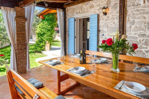 Willkommen in der Villa Olga, einem wunderschönen, traditionellen istrischen Haus im ruhigen Ort Dračevac, nur etwa zehn Autominuten vom Zentrum Porečs und den nächstgelegenen Stränden entfernt. Dieses charmante Haus wurde sorgfältig renoviert, um authentischen istrischen Stil mit modernem Wohnkomfort zu vereinen.Das vollständig umzäunte Grundstück der Villa Olga bietet vollständige Privatsphäre und Ruhe. Die Gäste können den Salzwasserpool genießen, sich auf den Sonnenliegen entspannen, die Außendusche nutzen und für Grillfreunde gibt es einen Außengrillkamin. Der großzügige Garten mit natürlichem Schatten bietet idealen Schutz an heißen Tagen, während die überdachte Terrasse mit Sitzgarnitur zu langen, entspannten Abenden und gemeinsamen Mahlzeiten im Freien einlädt. Zudem steht ein privater Parkplatz für zwei Fahrzeuge zur Verfügung. Die Villa Olga ist ideal für 4 bis 6 Personen und erstreckt sich über zwei Etagen. Im Erdgeschoss befinden sich ein gemütliches Wohnzimmer, ein Essbereich und eine voll ausgestattete Küche. Zwei klimatisierte Schlafzimmer befinden sich im Obergeschoss, jeweils mit einem eigenen Badezimmer und separater Treppe, was zusätzliche Privatsphäre und Komfort bietet. Alle Fenster sind mit Insektenschutzgittern ausgestattet, was besonders an Sommerabenden für angenehmen Aufenthalt sorgt. Dračevac ist ein ruhiges Dorf, umgeben von Natur, Weinbergen und Olivenhainen – perfekt für Gäste, die Ruhe und das authentische Istrien suchen. Trotz der ruhigen Lage ist das Haus sehr gut angebunden – Poreč, mit seinen historischen Sehenswürdigkeiten, Restaurants, Geschäften und Stränden, ist nur wenige Autominuten entfernt. Naturliebhaber und Aktivurlauber kommen auf den Rad- und Wanderwegen der Umgebung voll auf ihre Kosten.Villa Olga ist die perfekte Wahl für Familien oder Paare, die Tradition, Komfort und Privatsphäre mit der Nähe zu den Highlights Westistriens verbinden möchten.
