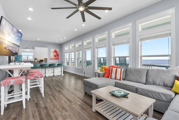 Adorned with nautical charm, 'Crystal Tides' exudes coastal elegance and modern comfort. The open floor plan, adorned with floor-to-ceiling windows, frames 180-degree views of the mesmerizing Crystal Beach. The kitchen, a culinary haven, features stainless steel appliances, gleaming white cabinets, and a sandy-tone backsplash, creating a perfect blend of style and functionality. Gather around the bar top seating for 8 or the dining table for a seaside feast that seats an additional 8 guests.