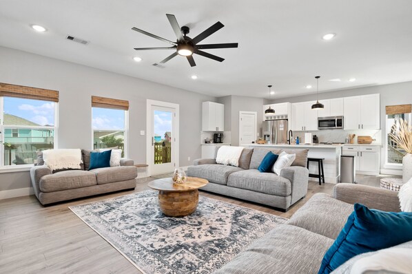 INDOOR LIVING: Modern beach-themed interior with brand new everything! 65” Smart TV with streaming services (bring your own passwords!) in the living room, Uno and various other board games available to entertain. Three spacious couches for ample seating.