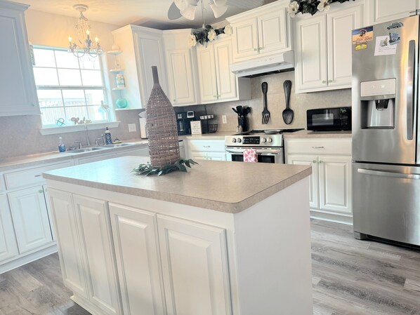 Step outside your door and onto the sandy shores, where the rhythmic waves provide a soothing soundtrack to your stay. Breathe in the salty sea air and feel the gentle caress of the ocean breeze.The views are truly "Shore 'Nuff" for an amazing vacation with friends and family. Fisherman Welcome!, there is room to park your boat, and the new boat launch on Yacht Basin Rd, is less than a mile away. This house features smart TVs in every room, with streaming Sling, Disney+, Netflix and DVD player also Wifi throughout the house. The well-appointed kitchen is a chef's delight, equipped with modern appliances and everything you need to whip up delicious meals. Enjoy your culinary creations in the dining area or savor a barbecue outside. It is a family oriented space designed for your comfort and enjoyment! Our beach house is a stylish retreat with 2 bedrooms and 2 bathrooms, providing ample space for 12 guests. The interior is thoughtfully designed, featuring a coastal-inspired decor that echoes the natural beauty just beyond your doorstep while feeling at home. Escape to Shore Nuff Beach House and immerse yourself in the coastal magic where the sands meet the sea. Your beachfront paradise awaits – book your stay now for a shore-nuff unforgettable experience!