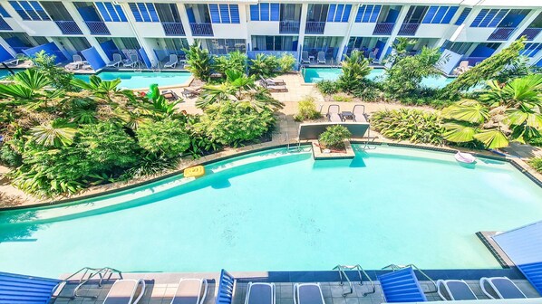 Guests enjoy access to resort amenities, including 6 large lagoon swimming pools, sun loungers, and a communal BBQ area - ideal for relaxing poolside or enjoying an outdoor meal. Just a short 500m walk to Four Mile Beach, you can enjoy a scenic 30-minute walk along the palm-lined white sand beach straight into Macrossan Street, the vibrant heart of Port Douglas with shops, restaurants, and cafes