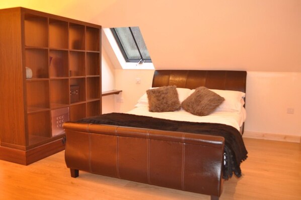 Unterkunft: Die East Barn und West Barns befinden sich in einem Gebäude mit Eichenrahmen und sind über eine Außentreppe aus Eichenholz zugänglich. Die Barns kombinieren traditionelle Handwerkskunst mit modernen Standards von Komfort und der Raum ist weitgehend offen. Jede Unterkunft verfügt über einen Holzofen, ein Schlafsofa, das für einen dritten Gast genutzt werden kann, einen Stuhl und einen Couchtisch an einem Ende, getrennt durch einen Bildschirm vom Kingsize-Bett und dem Duschraum. Die Küche ist gut ausgestattet und es gibt wenig Luxus wie eine Nespresso-Kaffeemaschine. Das Interieur wurde zu einem hohen Standard dekoriert, um eine moderne, aber gemütliche Atmosphäre zu gewährleisten. Es gibt einen Fernseher, der so geschwenkt werden kann, dass er von den meisten Teilen des Raumes aus gesehen werden kann und eine Waschmaschine / Trockner. Die Scheunen sind sehr gut isoliert, aber elektrische Heizungen sind für den ganzjährigen Komfort installiert. Ein geringer Aufpreis wird für Strom berechnet, der über eine Zulage verbraucht wird. Im Freien gibt es Zugang zu weitläufigen Gärten und Wäldern.