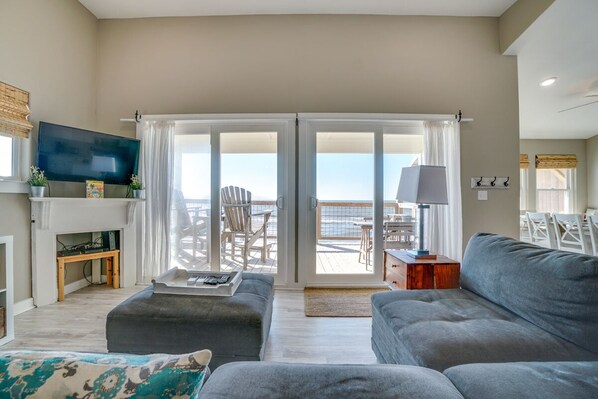 Stairs lead to a deck with incredible beach views, comfortable chairs, and an alfresco dining table to enjoy sunset meals. Stepping inside, guests will find pale laminate floors and an open living, dining, and kitchen area with beautiful views. A sectional sofa surrounds a 42†Roku TV and double sliding glass doors that open to the deck, which has tables and chairs. Hanging barn doors off the living area open to a guest bedroom with a queen bed. A light and bright kitchen features granite countertops and a breakfast bar that seats 2. An adorable dining nook has built-in seating with beach views and a dining table that seats 8. Down the hall is a bunk room with a twin-over-twin bunk bed and a guest bedroom with a king bed that share a bathroom. The primary bedroom has a king bed and a private bathroom.