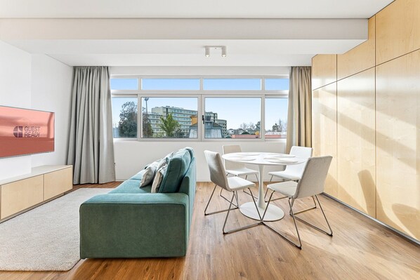 Ideal for couples or business travelers, this apartment features an open-plan living and kitchen area. The living room is equipped with a comfortable sofa and a round dining table, perfect for relaxing and watching TV.