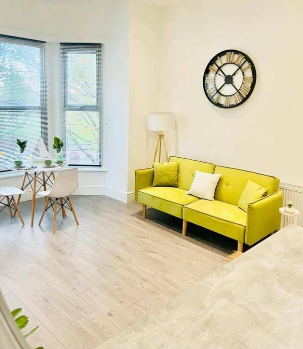 Dining areas include either a dining table and chairs located by the front bay window or a breakfast bar with bar stools in the kitchen area. The dining table is perfect for a romantic meal, while the breakfast bar is ideal for a quick bite before heading out to explore the city and seafront, or for feeding family and friends.