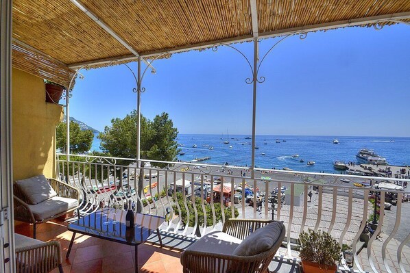 The terrace is 8 square meters (86 square feet) large. It is partly shaded by a pergola with a bamboo roof. It is equipped with a small sofa and two armchairs. From the terrace you will enjoy a gorgeous view of the beach and of the sea.