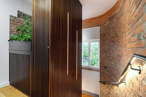 Der Wohnbereich wurde so gestaltet, dass er eine Geschichte erzählt und dem historischen Eigentümer des Gebäudes – dem berühmten Bildhauer Augustyn Schoeps – Tribut zollt. Eine Wand des Appartements ist mit schwarzer Tapete bedeckt, die Skulpturen zeigt, die von den Werken dieses großen Künstlers inspiriert sind.