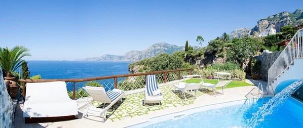 The blue Mediterranean sea is just below the property; the water can be reached by walking along a communal staircase of about 250 steps which leads to a sunbathing terrace on the cliff. The house is bright, spacious and comfortable, with high ceiling vaults and elegant and welcoming furnishings. The floors are tiled with shimmering majolica tiles. The total area of the villa is 110 metres squared indoors and 400 metres squared of the outdoor area consisting of terraces and gardens with magnificent views of the sea, of Praiano and the coast of Amalfi towards Positano and Capri.