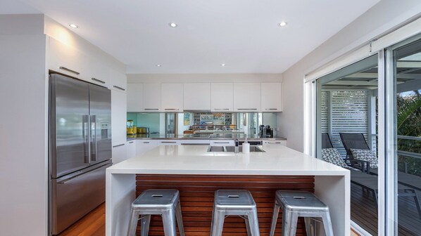 Stilvoll renoviertes Ferienhaus mit fünf Schlafzimmern gegenüber dem Turo Park und der Uferpromenade Pretty Beach. Offene Wohnbereiche öffnen sich auf das Vorderdeck, entspannen Sie sich und genießen Sie die ruhige Aussicht auf die Bucht