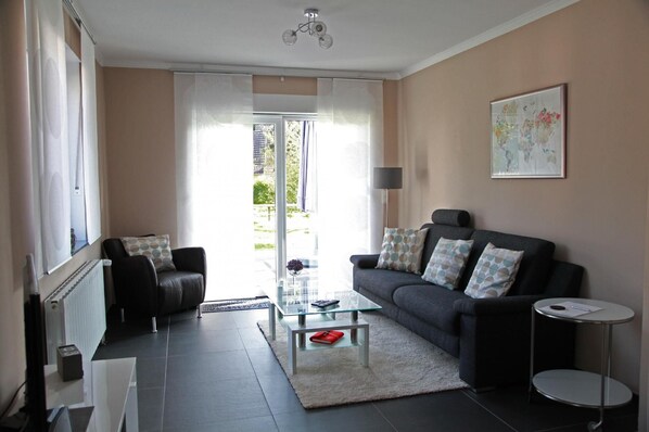 2014 komplett renovierte und neu eingerichtete Drei-Zimmerkomfort-Ferienwohnung in einem Zweifamilienhaus ist für ein bis vier Personen geeignet. Es gibt einen geräumigen Wohnbereich mit Fliesenboden und großzügigem Sitzbereich. Ein moderner Phonoschrank mit Sat-TV und Stereoanlage und eine gut ausgestattete Küche und Essbereich sind vorhanden. Es gibt eine neue Einbauküche, Spülmaschine und Mikrowelle, Kühlschrank mit vier-Sterne Gefrierfach, Herd mit Creankochfeld und separatem Backofen, Eßtheke für vier Personen, Hochstuhl, Kaffeemaschine, Wasserkocher und Toaster. Die Benutzung von Geschirrtüchern ist im Preis enthalten. Zwei Schlafzimmer mit Teppichboden sind vorhanden mit geräumigem Kleiderschrank und Kleiderstange, sowie ein komfortables Doppelbett (1,80 x 2,00 m) und Nachtschränke mit Lampen und zwei bequeme Einzelbetten (je 90 x 2,00 m) und Ablagetisch mit Lampe. Ein Badezimmer mit Eckbadewanne, Dusche 1,00 x 1,00 m mit Überkopfbrause und zusätzlicher Handbrause, WC, Handwaschbecken mit beleuchtetem Spiegel, Haartrockner, sind im Preis inbegriffen. Sonstige Räume, Gäste WC, · Abstellraum Waschmaschine, Trockner und vieles mehr sind vorhanden.