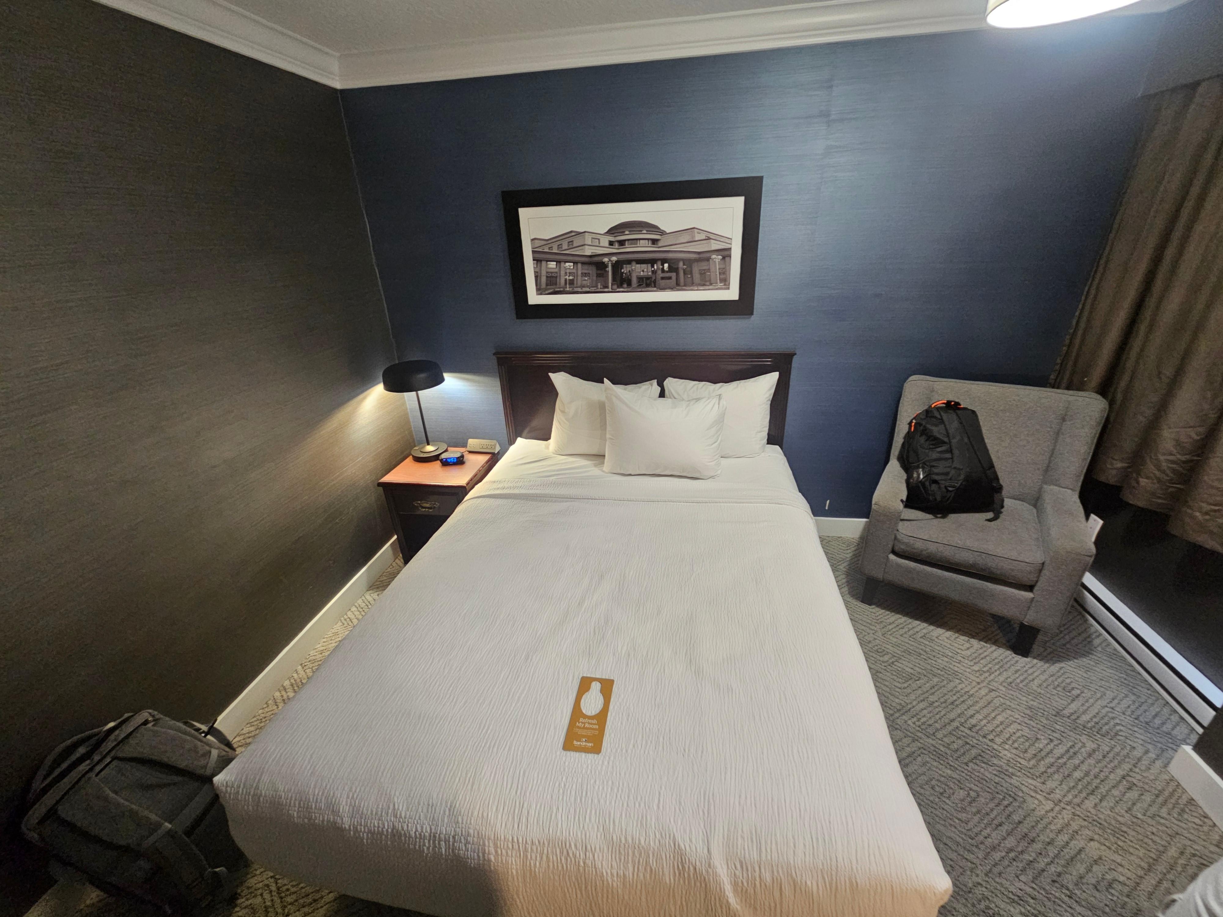 The whole place needs a deep clean. No elevator, dirty hallways. In our room the carpets were filthy and ragged. I found a sock on the floor by the desk. The little shampoo bottle was used and almost empty. No tv remote, headboard was grubby, cloth chairs were stained and dirty BUT the bed and sheets were clean and comfortable. Front desk staff were helpful and kind. I wouldn’t recommend this place at all!!