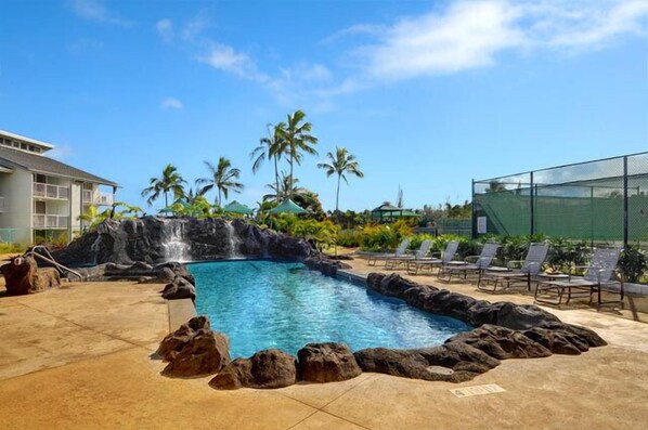 Schöne Designerinnenwohnung mit offenem Grundriss mit allem, was Sie für einen großartigen Urlaub brauchen. Im Ferienort Princeville erwartet Sie das The Cliffs mit einem neu gestalteten Pool mit Wasserfällen, einem Whirlpool und einem speziellen Bereich nur für Kinder. Ein sehr entspannendes und tropisches Gefühl.