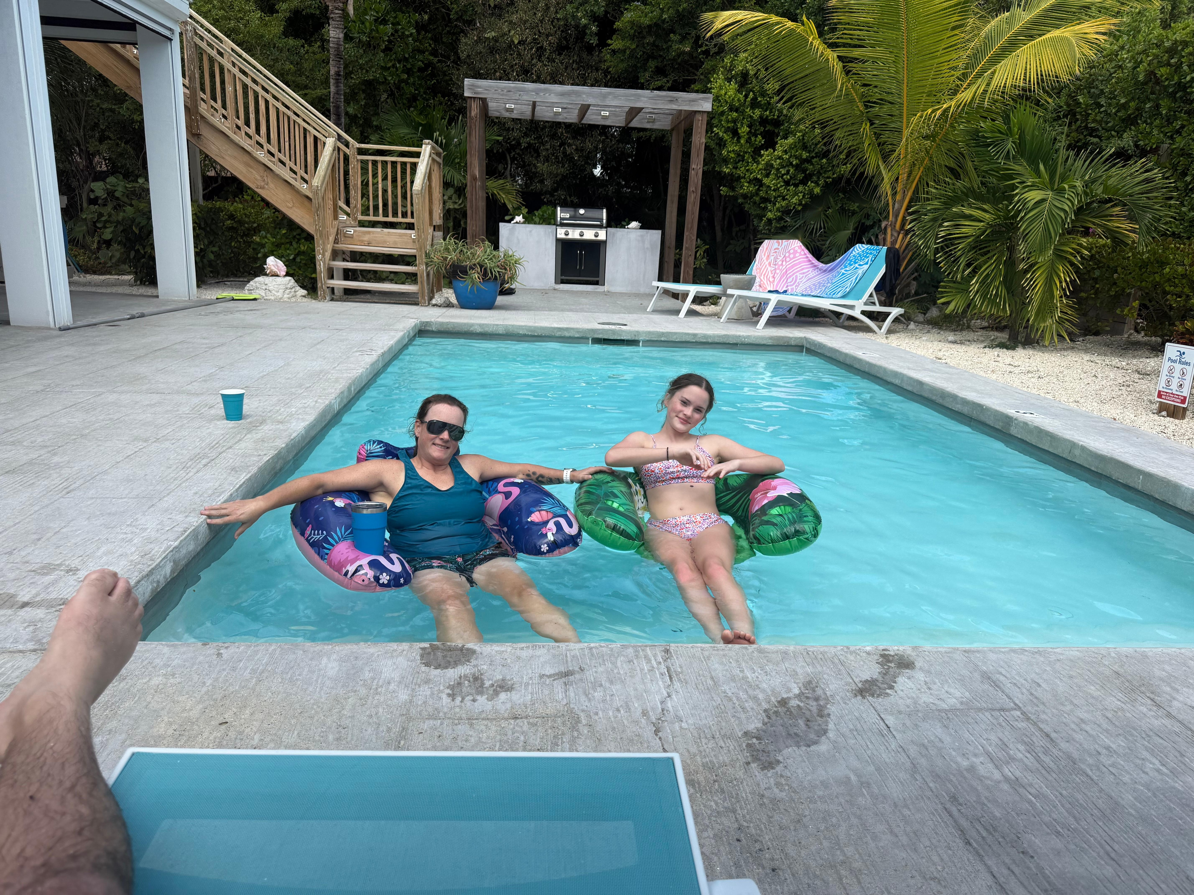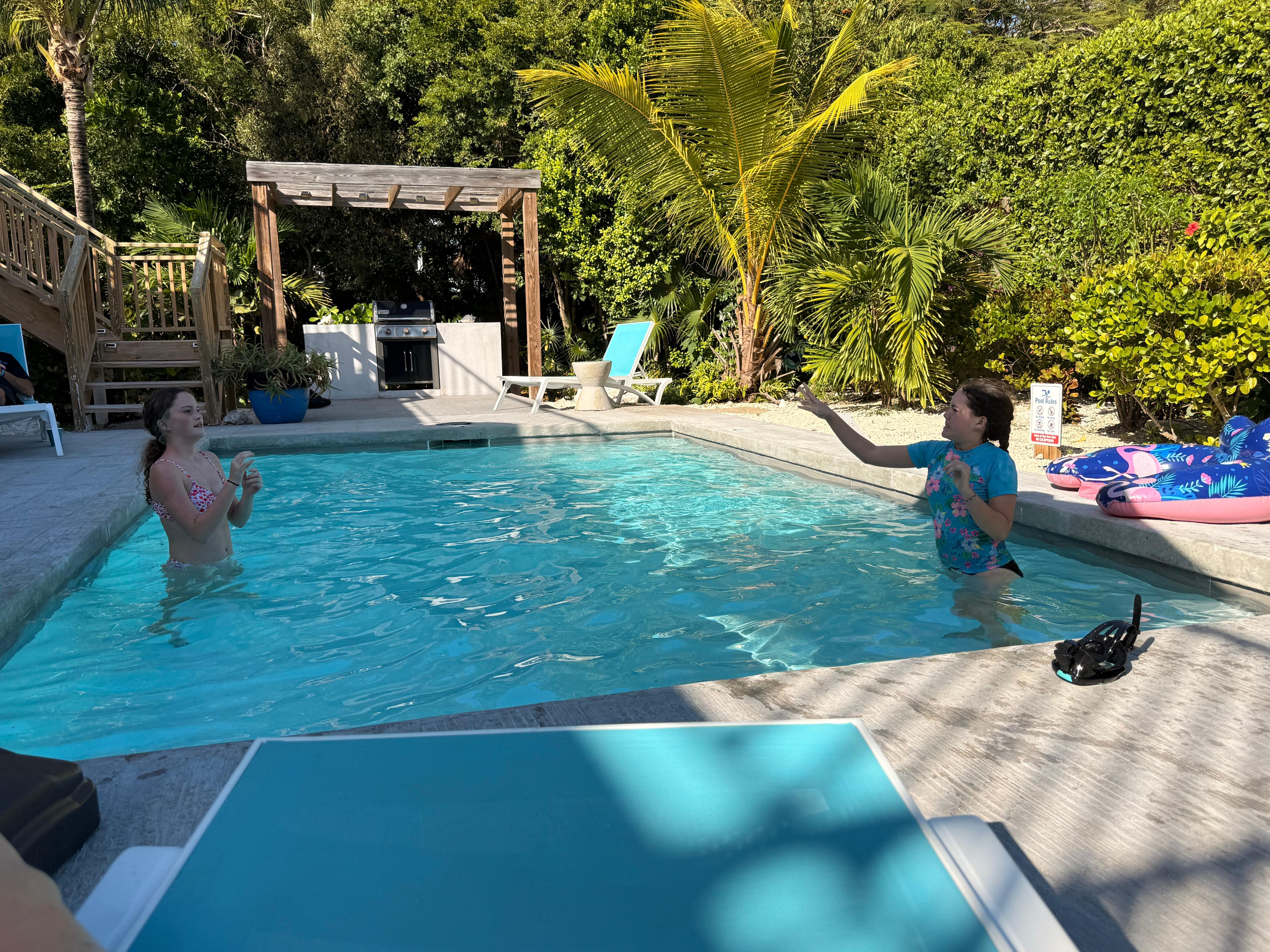 The pool deck offers outdoor dining, an entertaining sitting area, chaise lounges for sunbathing or relaxing, a BBQ grill area, and a solar-heated swimming pool. Alternatively, guests can enjoy cool island breezes on our rooftop deck. The rooftop deck is ideal for coffee at sunrise or cocktails at sunset. In addition, for security purposes the villa has a ring doorbell on the front door with an indoor chime so you can hear when visitors or drivers are at the front door as well as monitored security cameras located at the entrance of the driveway/villa. A security system is also available for use throughout your stay.