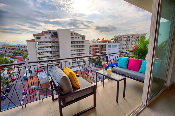 Apropos Balkon ... es ist riesig! Es umschließt die gesamte Einheit und verfügt über drei separate Sitzbereiche, um das üppige Grün, den Meerblick und die Action auf den kopfsteingepflasterten Straßen zu genießen.