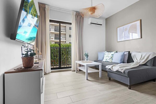 Der helle Wohnbereich bietet ein bequemes Sofa (als Schlafsofa für zusätzliche Flexibilität nutzbar), Smart-TV und warme, natürliche Dekoration. Große Fenster öffnen sich zum Balkon und lassen viel Licht hinein – ideal zum Entspannen, Lesen oder Arbeiten im Homeoffice.