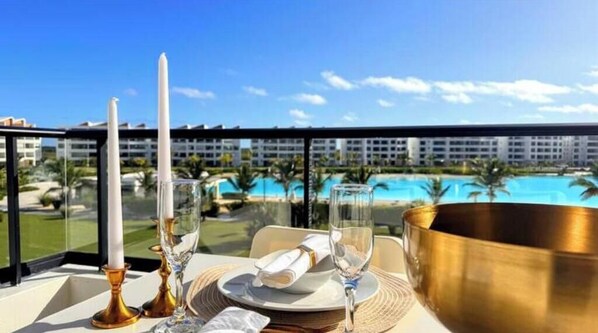 🛋️ Relax in the bright living area or enjoy rejuvenating pool & water views. Step downstairs to soak in another view just outside your door.